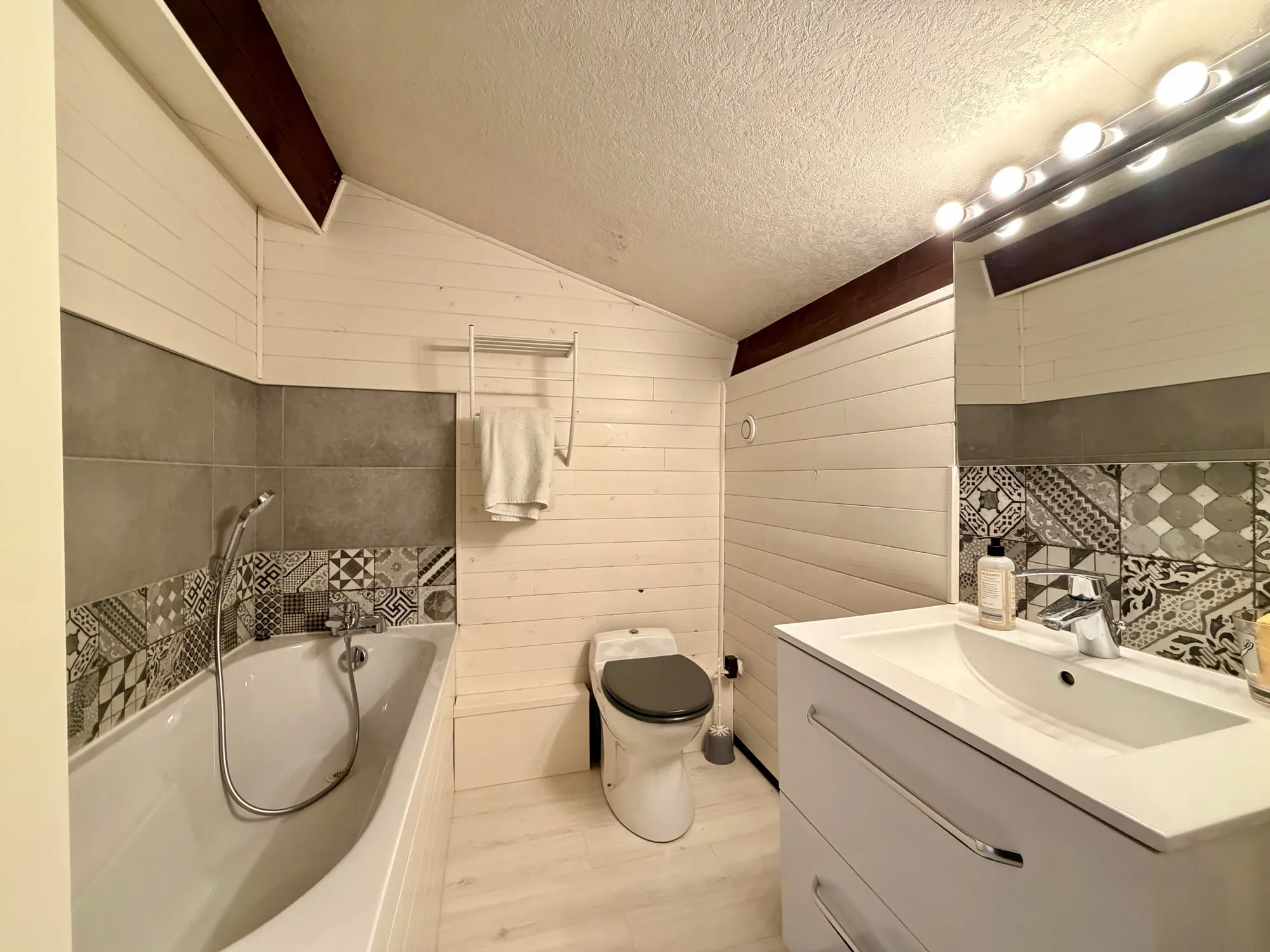 - Une salle d'eau avec douche et baignoire.