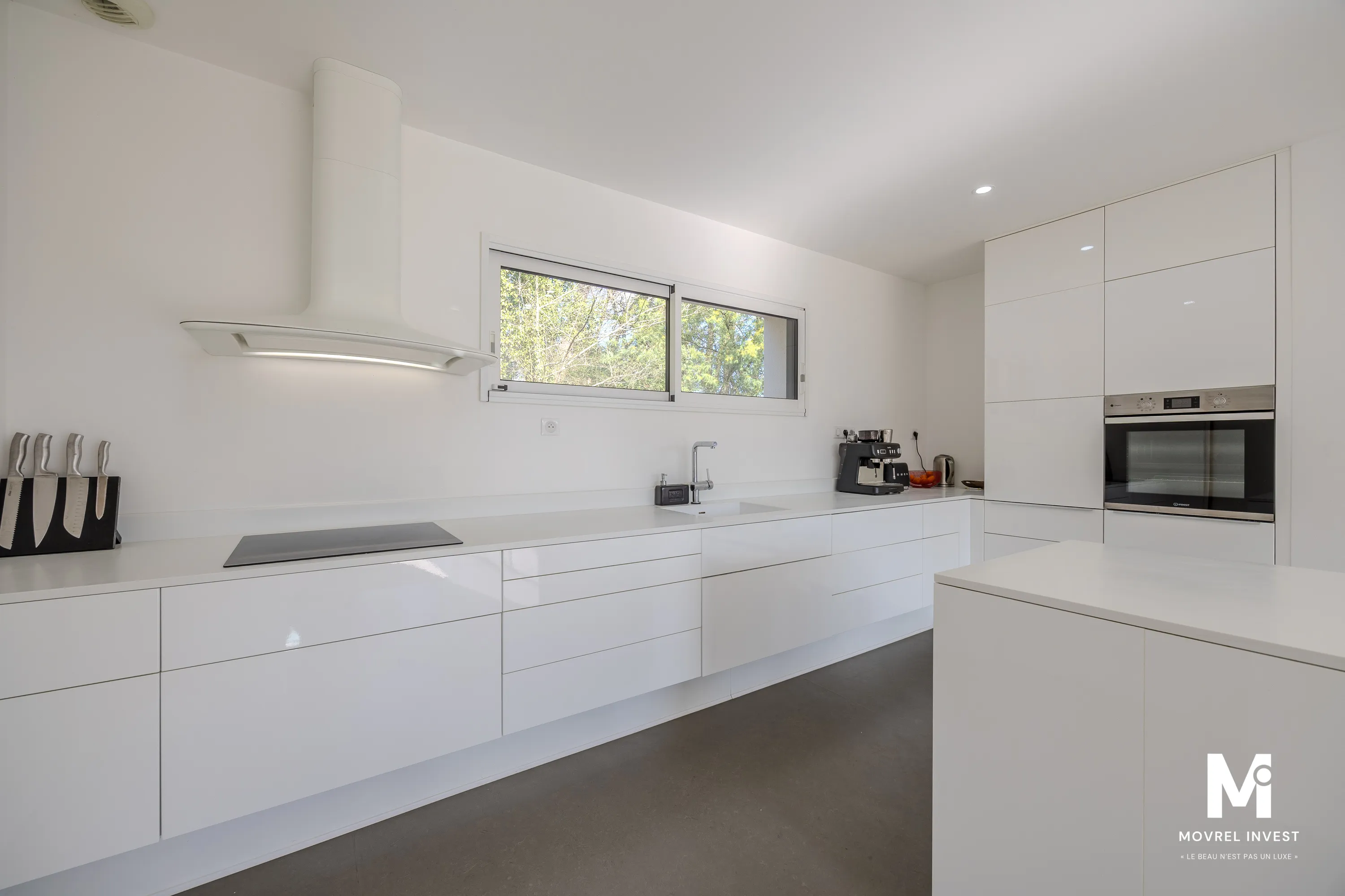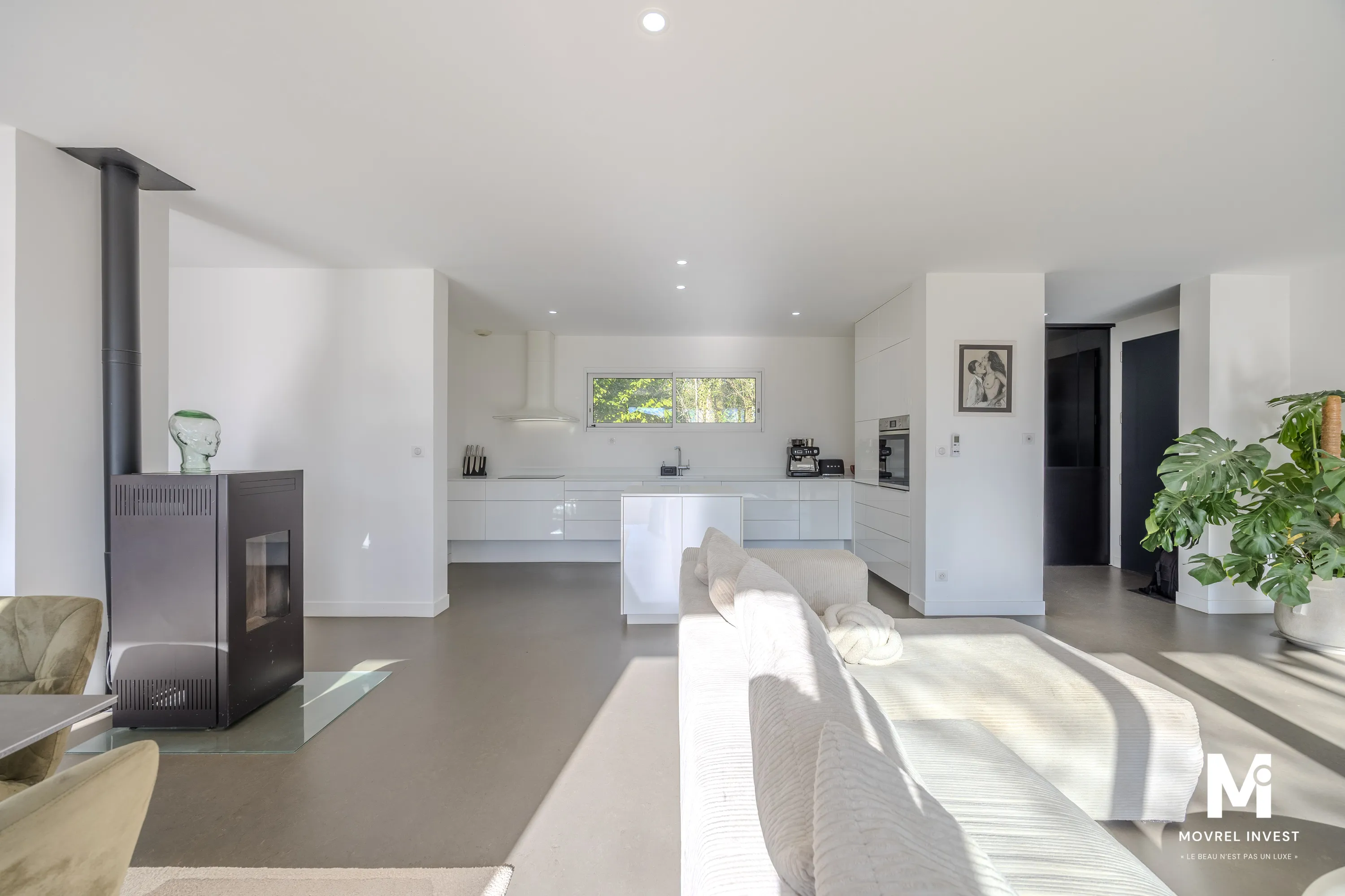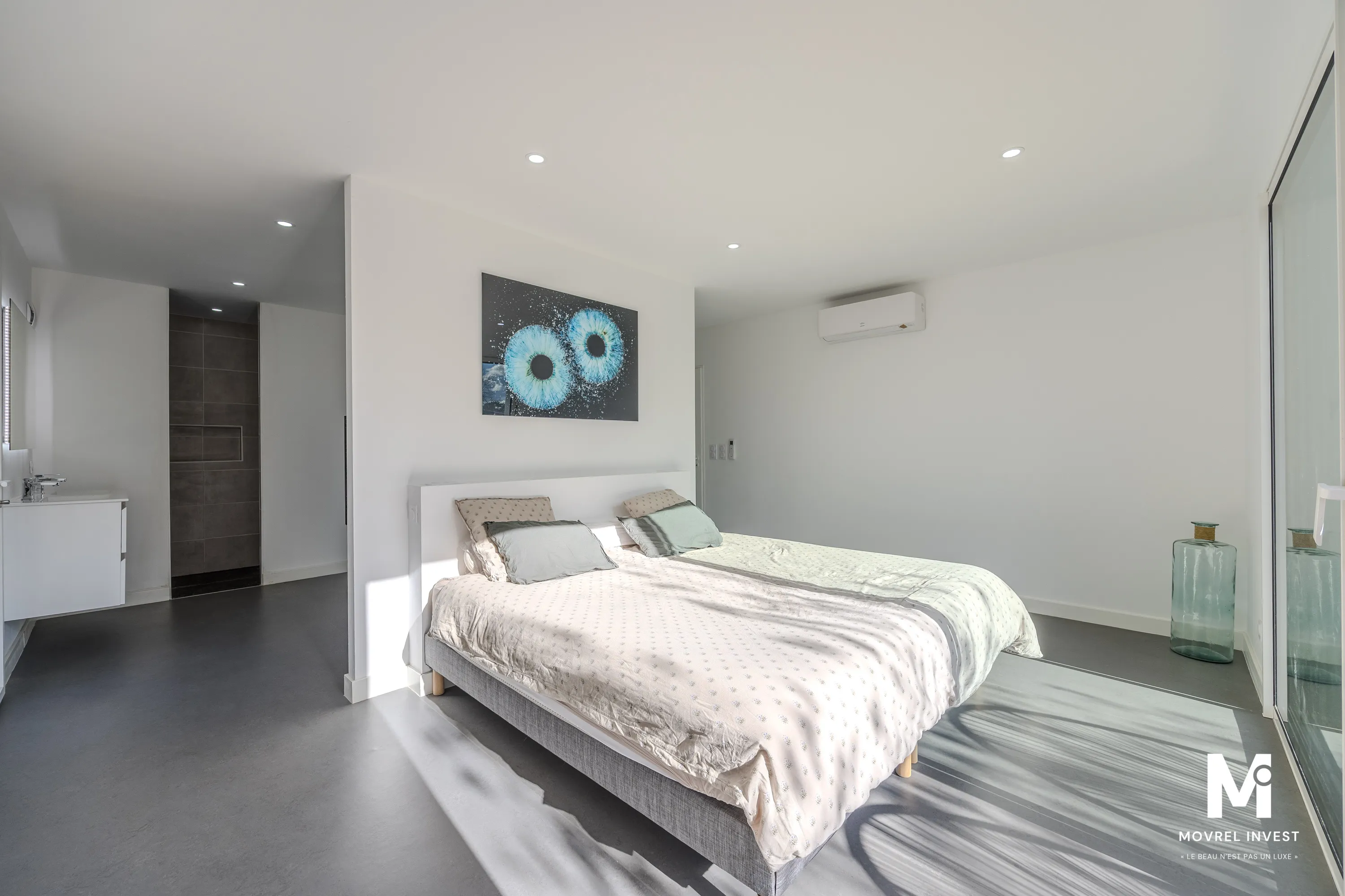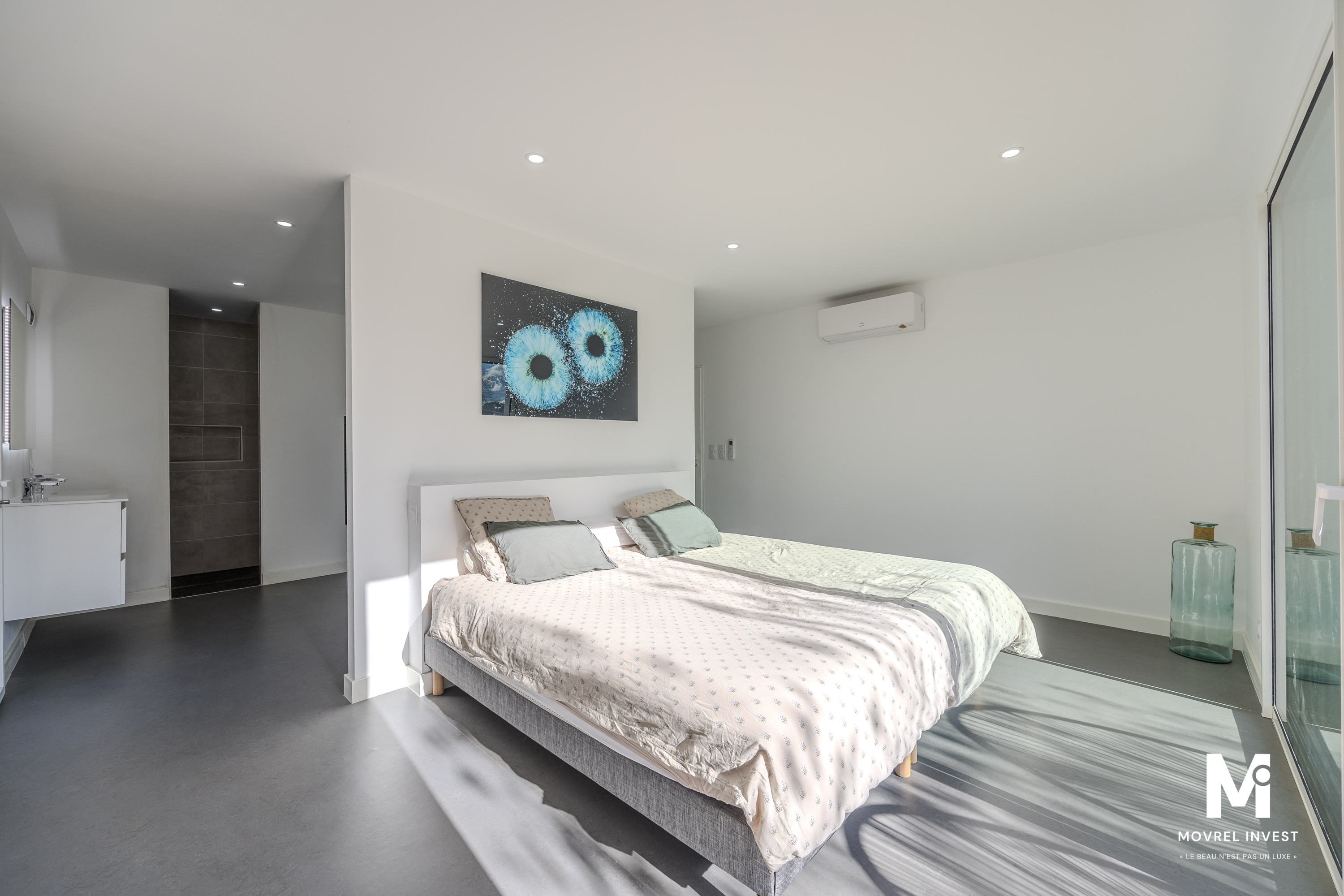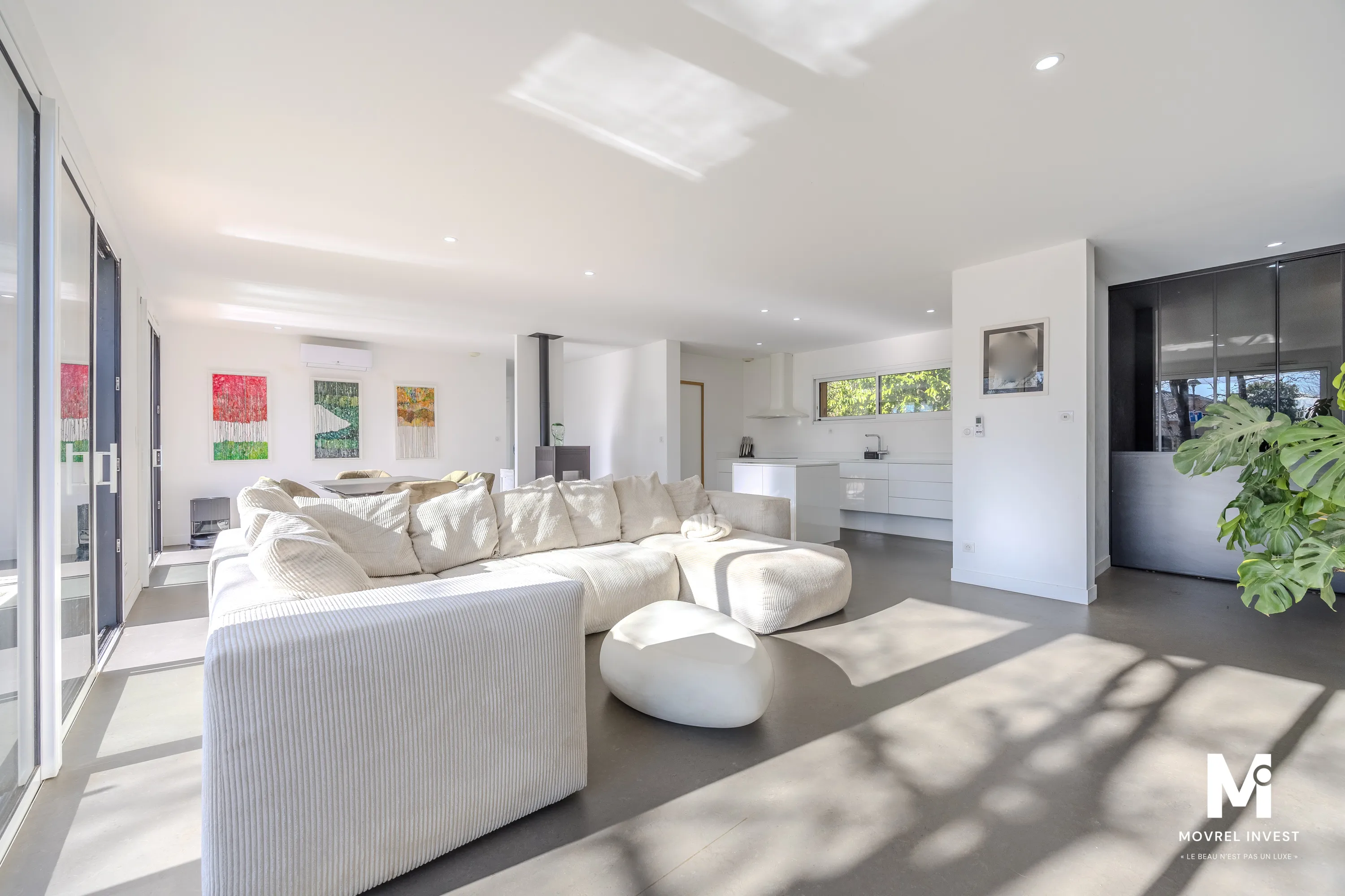 Architecture cubique de plain-pied, elle se compose d'un SAS d'entrée avec placard donnant sur séjour/salle à manger ultra lumineux de 55 m², une cuisine fonctionnelle, équipée et aménagée, de 3 chambres spacieuses avec placard dont une suite parentale de 36 m² avec dressing et salle d'eau équipée d'une double douche, une salle d'eau, un cellier/buanderie, 2 WC.
